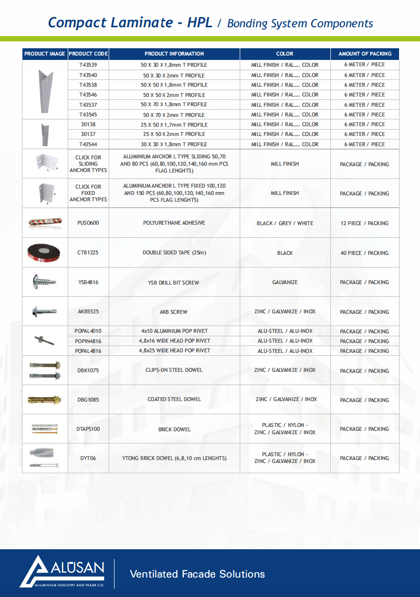 This system is applied by sticking Compact Laminated Panels on the load- bearing base construction composed of aluminum anchorages and aluminum vertical T profiles using polyurethane adhesive and double-sided tape. This system is preferred owing to its cheap and fast installation. There can be open joint gaps, or the gaps can be covered with Aluminum fuga profiles.